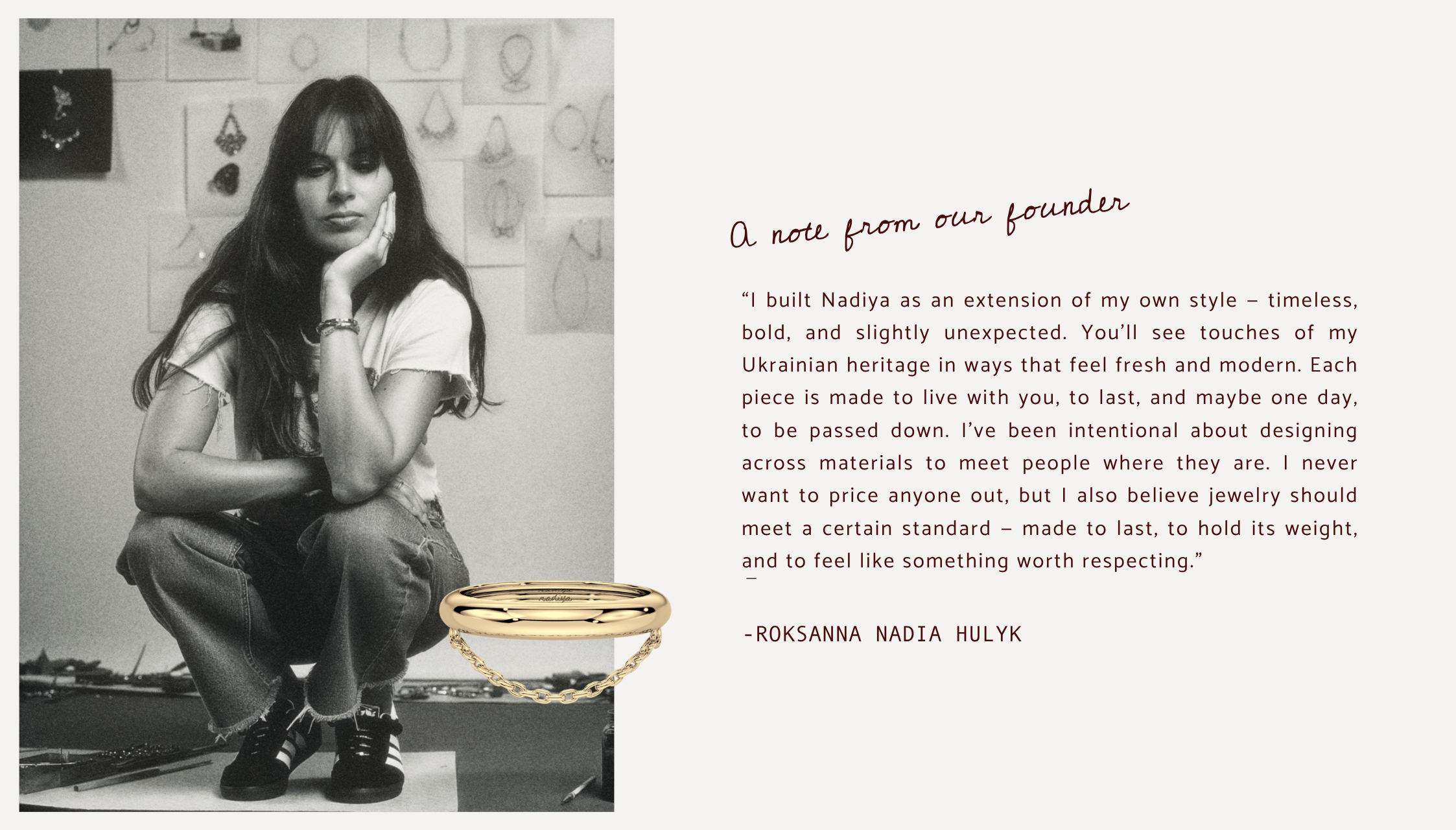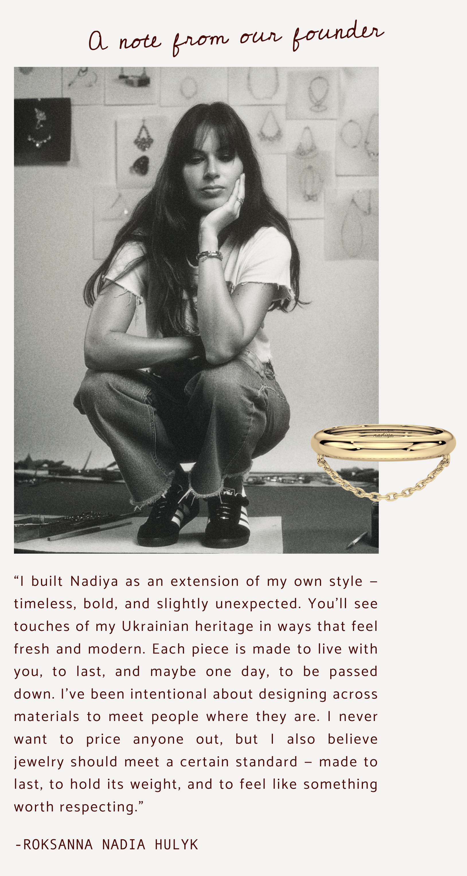 From our founder’s Ukrainian heritage comes Nadiya — meaning “hope.” Each piece is meant to be lived in and loved in ways that feel unapologetically you.